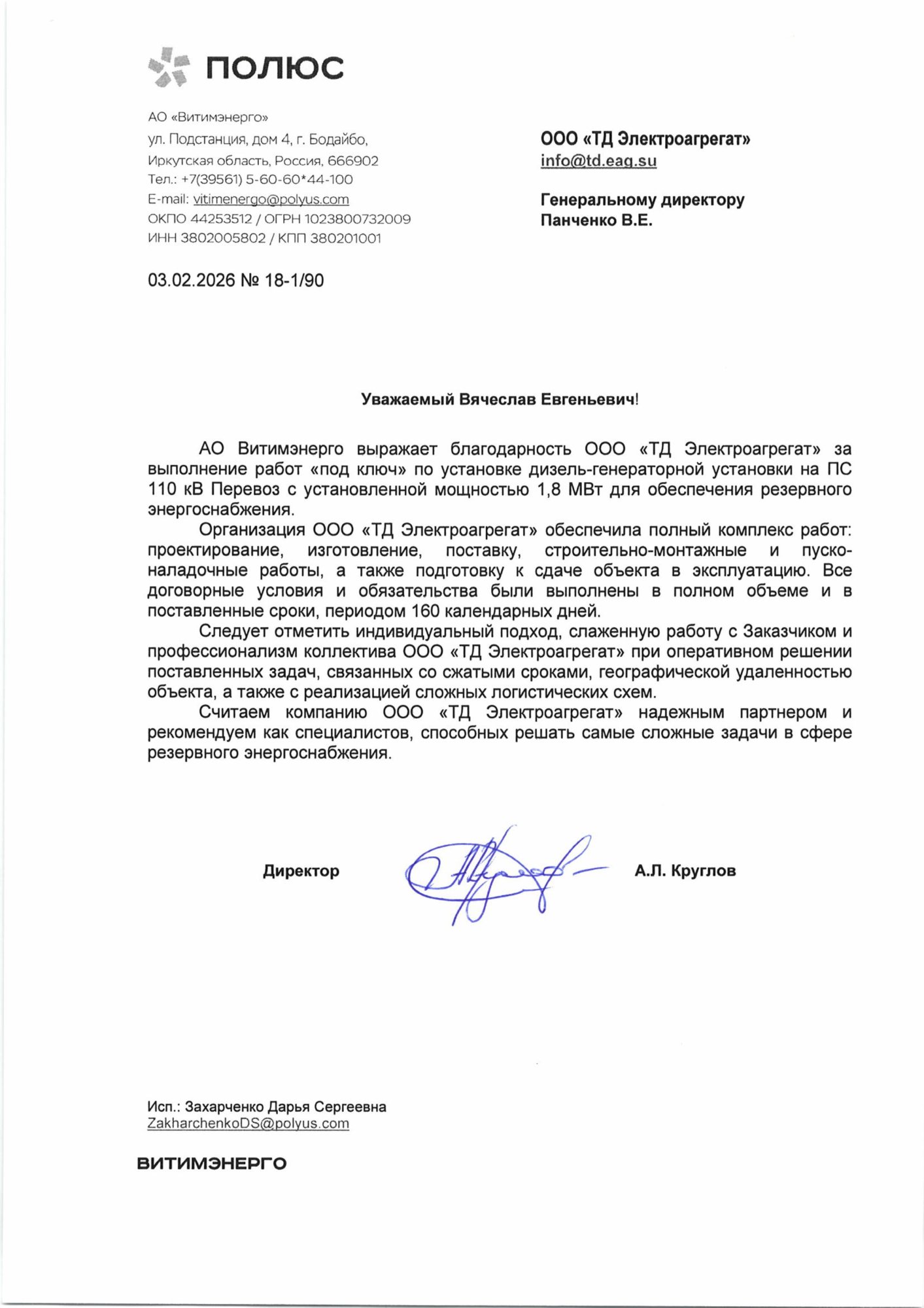 Отзыв контрагента о компании ООО «ТД Электроагрегат» и исполненном проекте для АО "Витимэнерго"